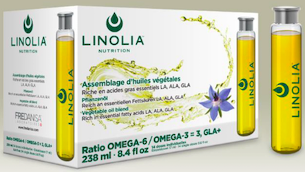 1 box contains 14 bottles of 17 ml, each containing a blend of 2257 mg of LA, 578 mg of GLA, and 2825 mg of ALA (olive oil, flaxseed oil, borage seed oil, and sunflower oil, as well as natural tocopherols).